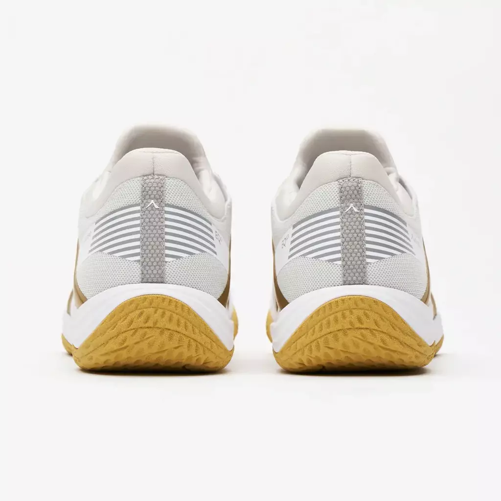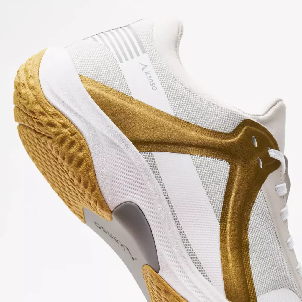 Copo de calcanhar moldado firme e ajustado ao lastro exclusivo da Kanso gera estabilidade para partidas rápidas e paradas durante a prática.